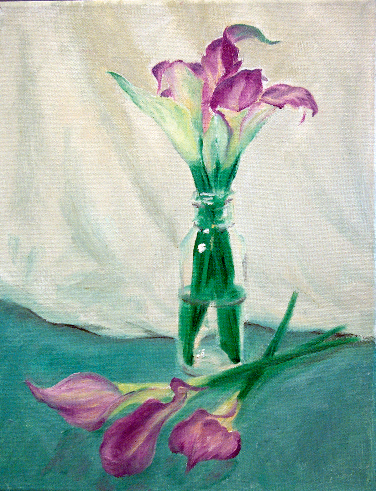 Fresh and bright, these Delicate Calla Lilies in a clear glass bottle vase would be a pleasant addition to any room. Their large silky petal is delicate and white underneath but rich and multi-hued purple on the inside. Their reflection can be seen in the blue-green frosted glass below with gentle and warm white folds of cloth draping behind them. Truly unique flowers that smell as good as they look! Hand painted with archival oils on canvas and no solvents to ensure generations of viewing pleasure.