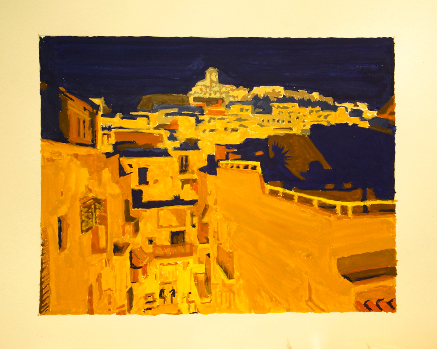 Painted in gouache from a photo taken by the artist in Ibiza. Featuring a night scene in one of the most wondrous and enchanting cities in the world this is a place that will always be in the heart of those who spend time there. In a unique process so time consuming that it will probably never be used again, the original photo was posterized and abstracted using a computer then meticulously transferred to bristol board then painted with toned and hue shifted gouache to provide realistic color elements to an almost non-representational scene. Many details of life are shown including two people seated at the bar below to help transport the viewer to this amazing destination.
