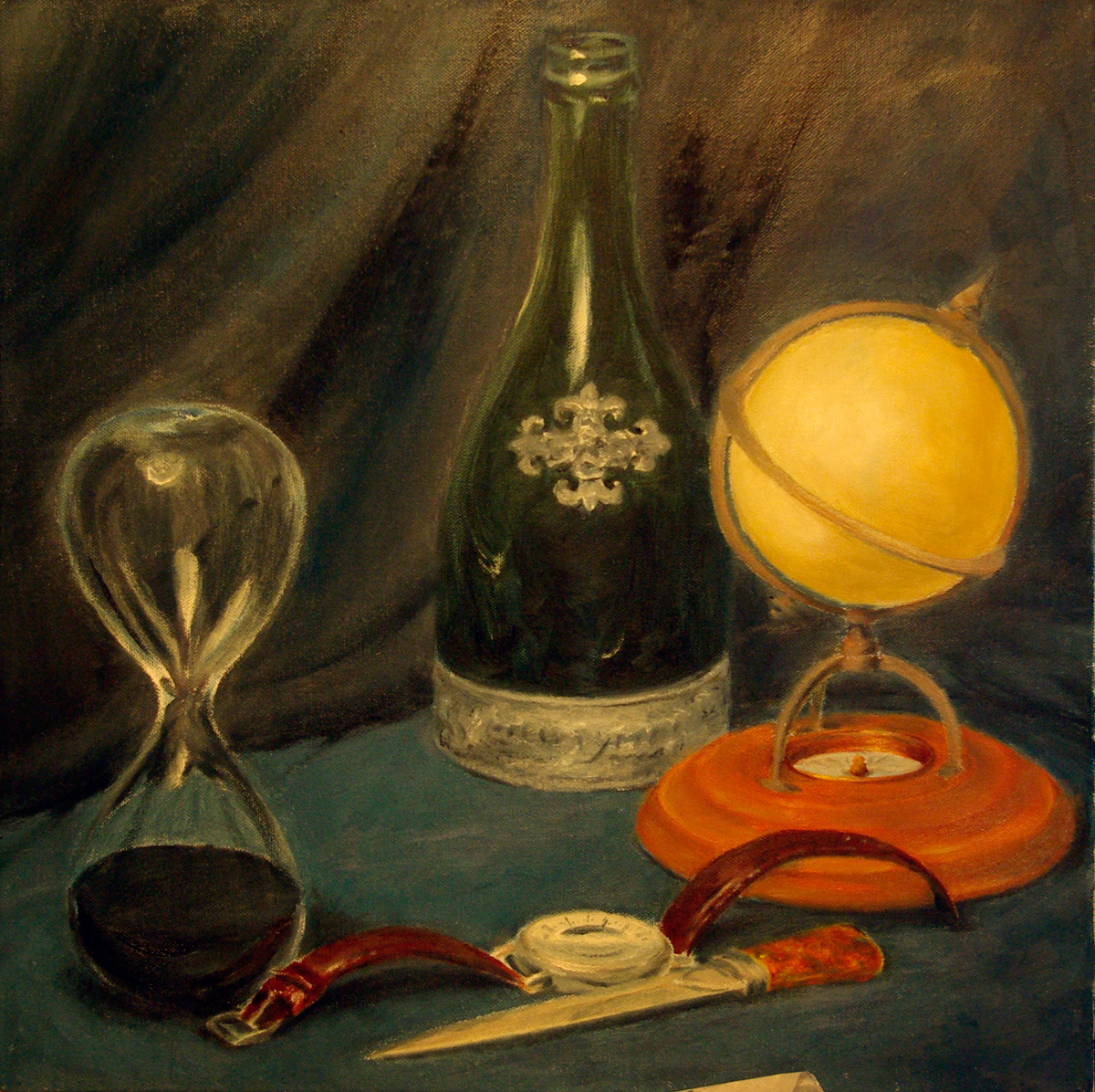 A low key painting, characterized by a majority of the surface being darker than 50% gray, this work features elements of time and travel. The darker tone sets a mysterious mood ideal for an adventurous journey or telling the story of a great memory. For an additional $150 I'll paint in a map on the globe. This piece is much larger than the others I think 32" square
