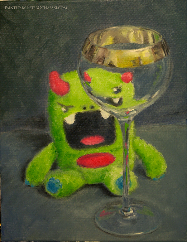 So-so-happy toy monster distorted through a wine glass with a golden metallic plated ring around the top. The stuffed monsters expression changes when seen through the glass to reveal that he is, in fact, smiling on the inside. The metal reflection blend into abstract shapes but the artists studio and outline can be found in the details of the reflection. As a side note, can't say enough good things about So-So-Happy, they are a wonderful company with kind and generous employees.