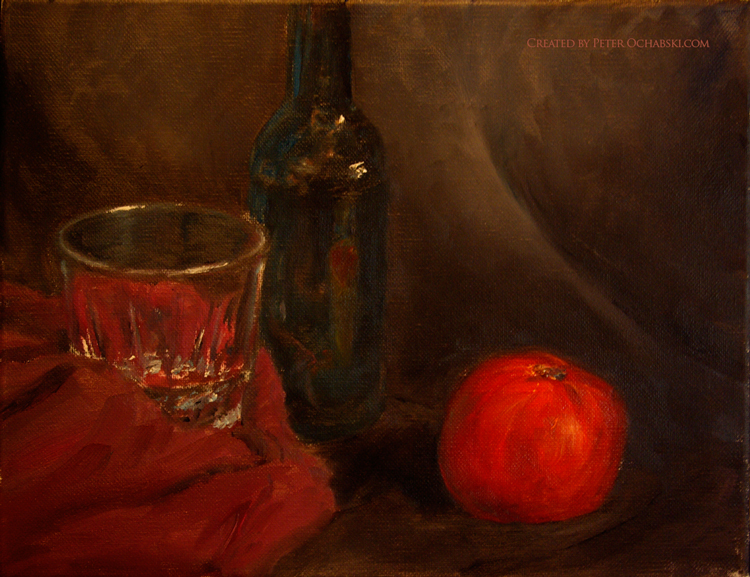 Casual still life featuring the warm colors of a crisp apple, layered onion and a white sugar pot on a earthy background. Detailed shadows, reflections, and highlights offer places for the eye to linger among the soft browns and golden light. Feels like the country or perhaps Tuscany in the spring or fall. Deep textures mix pleasantly with soft impressions of color. Hand painted on archival quality canvas with high quality oil paints and no solvents to ensure generations of enjoyment.