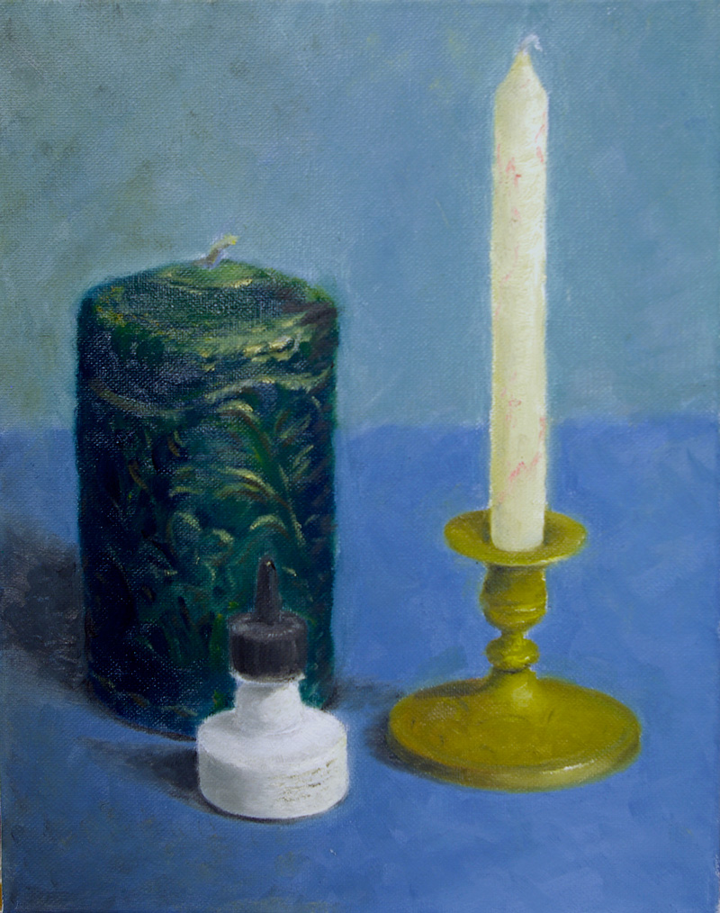 Illumination is a form of embellishing text with flourishes, details and small illustrations to help bring it to life. Here an white ink pot used to illuminate text is shown with candles that do the job literally. Special attention was given to the pattern around the main dark candle and the way it catches light and deforms around the surface.
