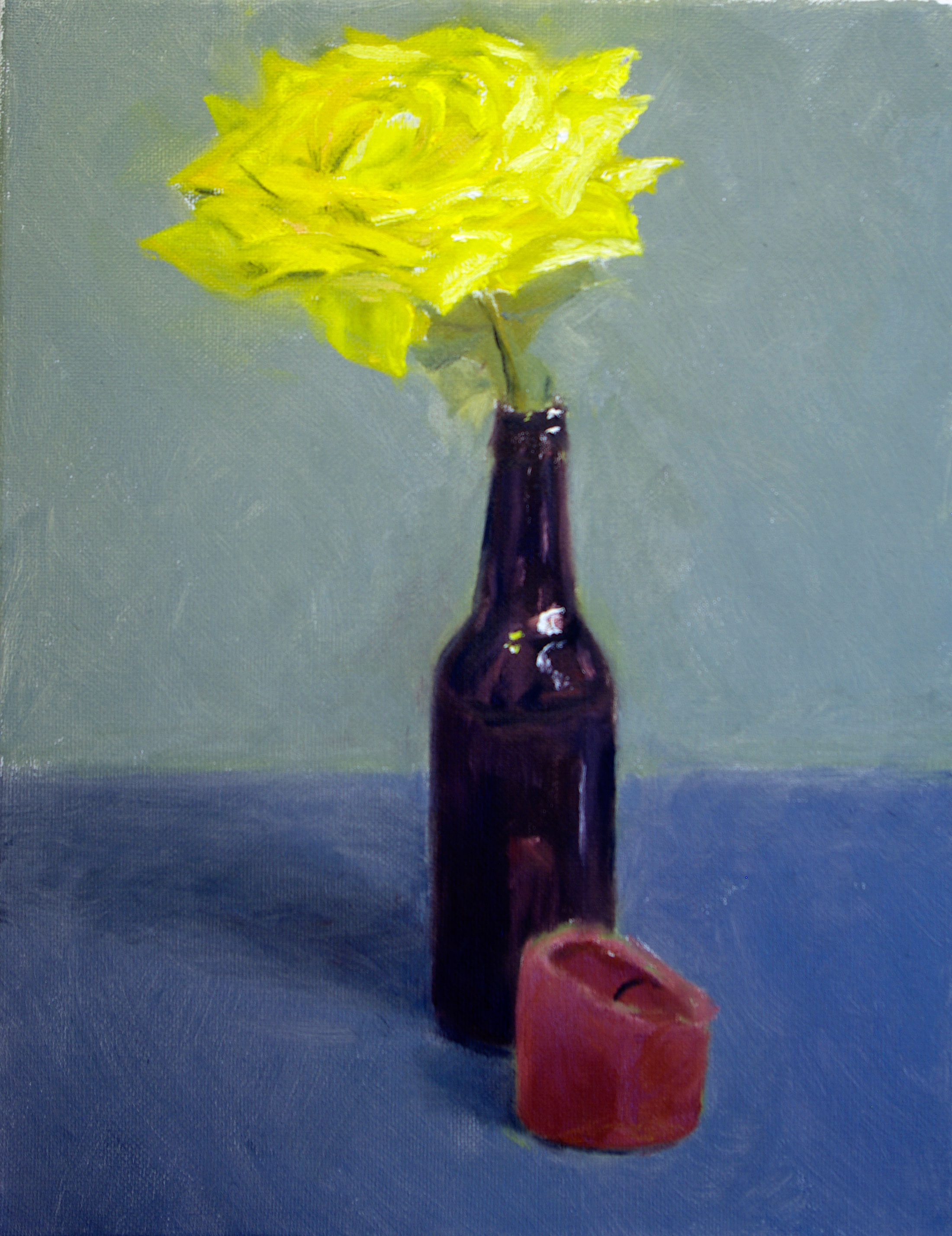 The stark contrast of a blooming beautiful yellow flower and a mundane bottle provide a sense of space and detail all at the same time. Here, the details and reflections on the bottle elevate it to be a worthy vessel for one of natures most delightful displays.