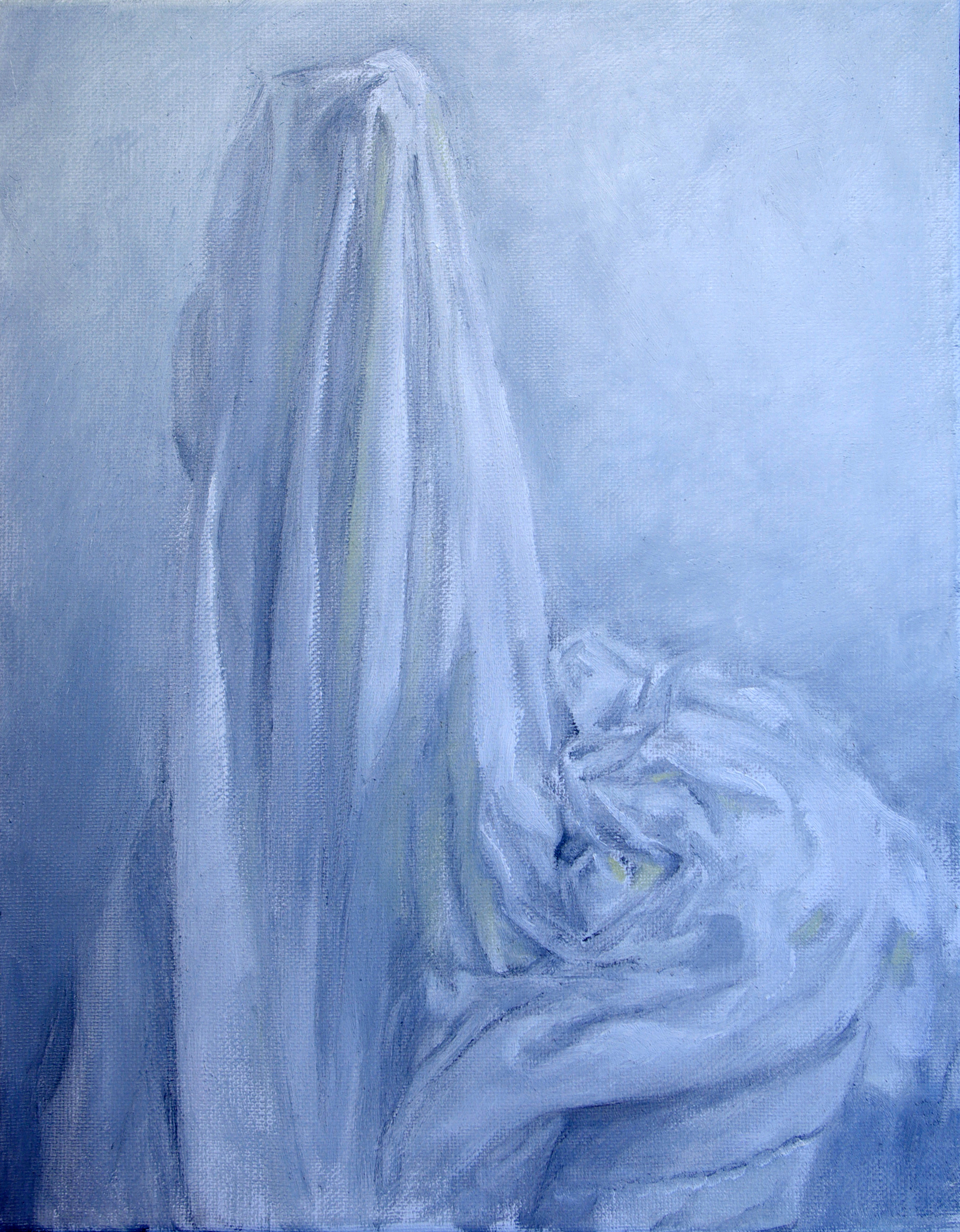 The serenity and rhythm created by folds of cloth can be mesmerizing. The patterns of light and dark repeat but never exactly the same way twice. Before one fold ends the next has already begun, each an individual but also affect by all those around it. Here a hint of light glows through the fabric and allows us to see through slightly hinting at what is beneath it. On the left the cloth flows and drapes like a cascading waterfall and to the right the cloth coils into something like water draining away. Only high quality oils on archival canvas with no solvents used to ensure color and quality don't degrade over time.