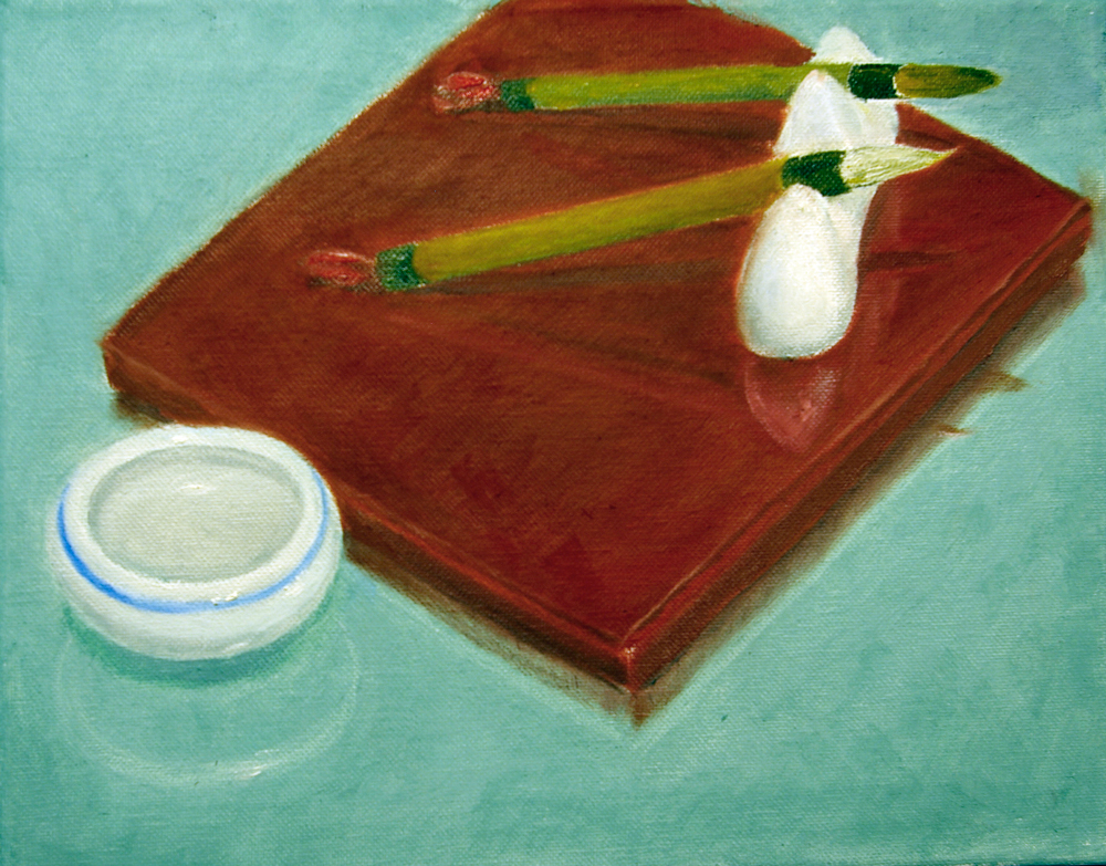 Sho-do is a Asian style of calligraphy that was originally developed in ancient China. The practice of this art is similar to meditation and takes effort and dedication to master. Here, using high quality oil paints on archival quality canvas, are some of the tools used in Sho-do resting on a frosted glass table. Please note: This is a work in progress that will be finished soon.
