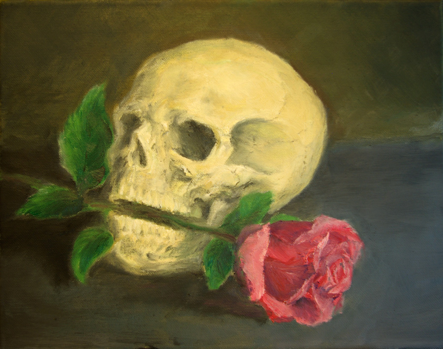 A celebration of life, even in the jaws of death. Also a twist on the romantic notion that love survives everything. Then there is the implied notion that someone danced to their last day, free of regret and savoring every last moment. We must embrace the moment and live every day to the fullest because every day is a gift to enjoy, not take for granted. All this and your interpretation as well. High quality oils on archival canvas. Original and one of a kind.